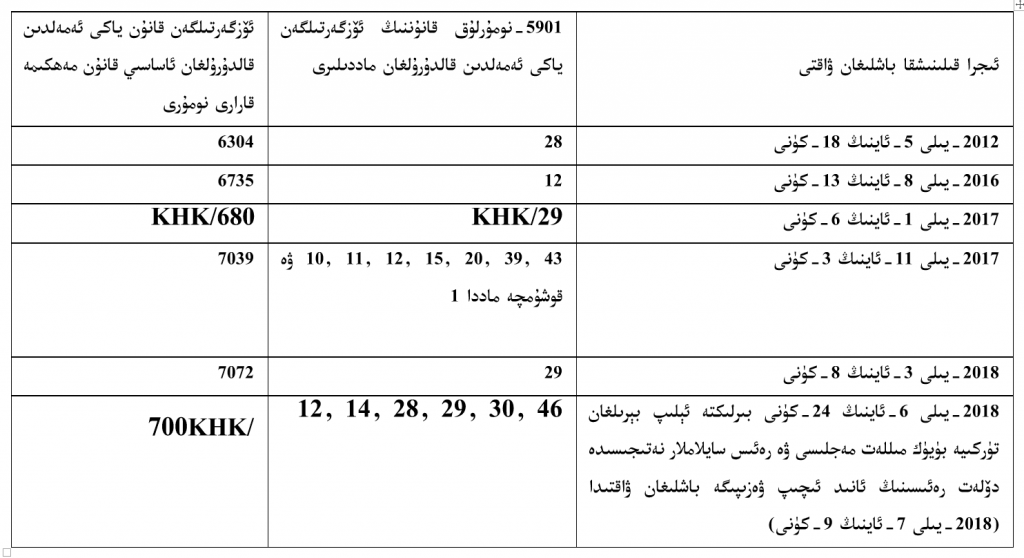 5901-نومۇرلۇق قانۇنغا قوشۇمچە ۋە ئۆزگىرىش ئېلىپ كەلگەن ھۆججەتلەر ياكى ئاساسىي قانۇن مەھكىمىسى قارارلىرىنىڭ ئىجرا قىلىنىشقا باشلاش ۋاقىتلىرى كۆرسىتىلدى.