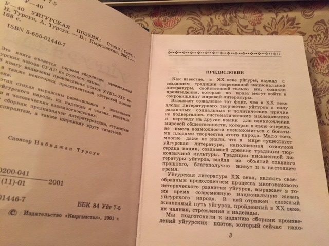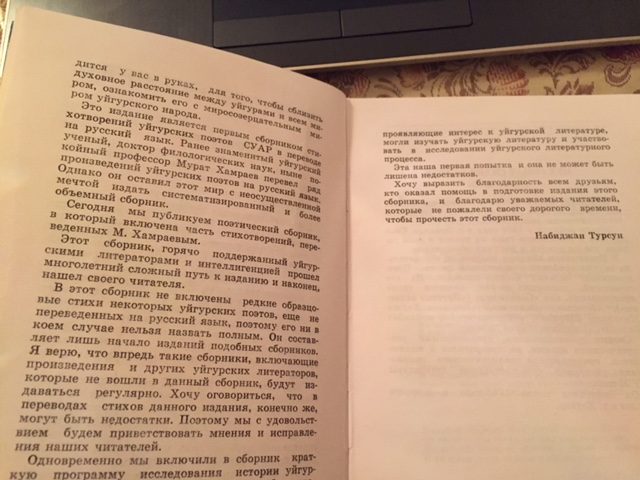 قولۇمدىكى «ئۇيغۇر پوئېزىيەسى» ناملىق كۆك تاشلىق قاتتىق مۇقاۋىلىق رۇس تىلىدىكى شېئىرلار توپلىمى ھازىرغىچە دۇنيا يۈزىدە تۇنجى قېتىم ئۇيغۇر شائىرلىرىنىڭ نادىر شېئىرلىرىنىڭ تاللانمىلىرىنىڭ مەخسۇس بىر توپلام ھالىتىدە رۇس تىلىغا ئوخشاش ياۋروپا تىللىرىدا چىقىشىدۇر. مانا بۇ خىزمەتنى بىز ئاكا-ئۇكا ئىككىمىز بۇنىڭدىن 20 يىللار ئىلگىرى ئورۇندىغان ئىدۇق، بولۇپمۇ شەرقىي تۈركىستان ئۇيغۇرلىرى ئارىسىدا بىرىنچى بولۇپ، 2003-يىلى، پەلسەپە پەنلىرى دوكتورىلىق ئۇنۋانىغا ئېرىشكەن مەرھۇم ئىنىم ئابدۇرېھىم تۇرسۇن ئالاھىدە تۆھپە قوشقانىدى.