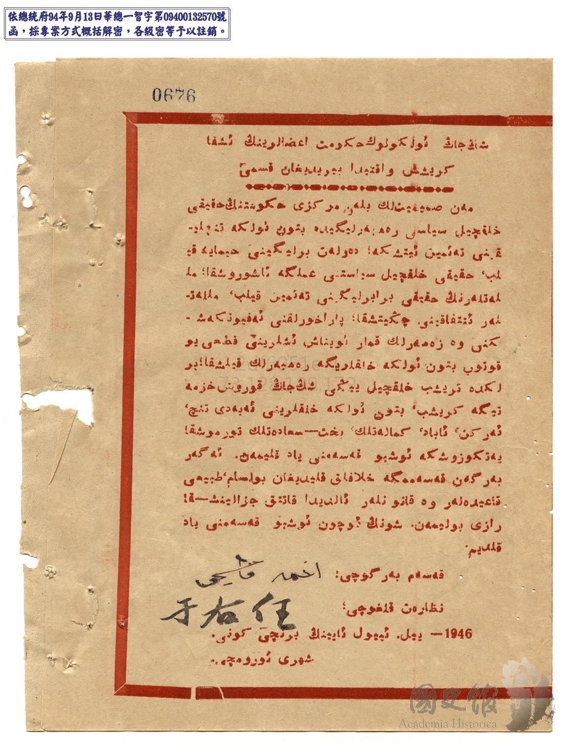 «شىڭ جاڭ ئۆلكىلىك ھۆكۈمەت ئەزالىرىنىڭ ئىشقا كىرىش ۋاقتىدا بېرىدىغان قەسىمى» ناملىق ھۈججەتتە ئەخمەتجان قاسىمىنىڭ ئىمزاسى. 1946-يىلى 1-ئىيۇل