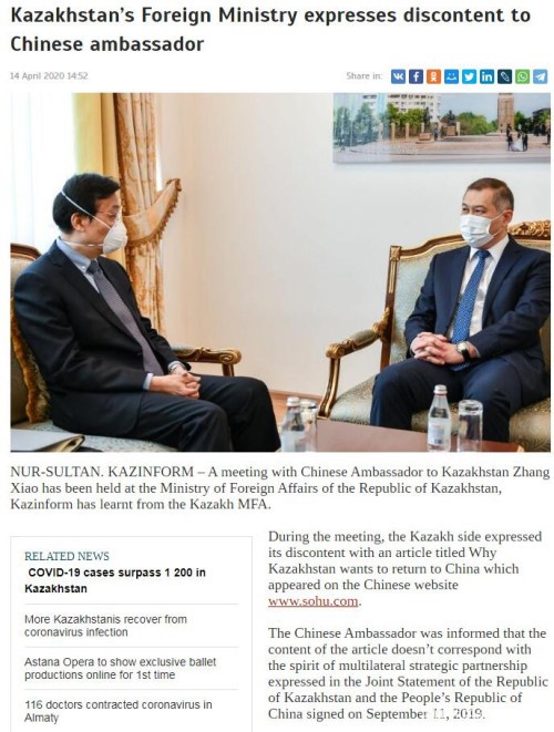 2020-يىلى 8-ئاپرىل كۈنى خىتاينىڭ «سۇخۇ.كوم»[1] ناملىق تور بەتىدە » قازاقىستان نىمە ئۈچۈن خىتاينىڭ قوينىغا قايتىپ كەلىشكە ئىنتىزار؟» دىگەن ماۋزۇلۇق ماقالە ئىلان قىلىنغان ئىدى.