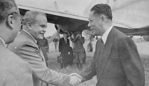 خىتاي تاشقى ئىشلار مىنىستېرى سۇڭ زىۋېن موسكۋا ئايردرومىدا سوۋېت تاشقى ئىشلار مىنىستېرى مولوتوۋ بىلەن كۆرۈشمەكتە. 1945-يىلى ئىيۇل