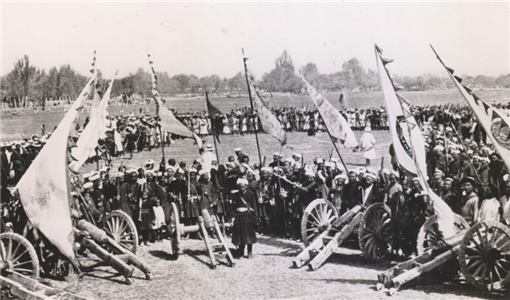 دەريا بويىدىكى كەڭ كەتكەن سايلىق تۆت تەرەپتىن جەم بولغان ئادەملەر بىلەن تولغان بولۇپ، مىغ-مىغ ئادەملەر توپى ئارىسىدا، كەتمەن-گۈرجەك كۆتۈرۇپ چىققان دېھقانلارمۇ، قولىغا ئوۋ مىلتىقلىرىنى ئېلىپ تاغدىن چۈشكەن ئوۋچىلارمۇ، تەككە-دەرگاھلاردىن چىققان سوپى-ئىشانلارمۇ، مۇھەممەد ئىمىن بۇغرانىڭ ئىككى ئىنىسى ئابدۇللا بىلەن نۇر ئەخمەدكە ئەگەشكەن نەچچە مىڭلىغان ئىلچى ئەتراپىدىكى دېھقانلارمۇ بار ئىدى. ھەر كەسىپ، ھەر يەرلىك ئىنسانلار بىر-بىرىگە ئارلىشىپ، سەپ-سەپ بولۇپ قاتار-قاتار تۇرۇشقان ئىدى.