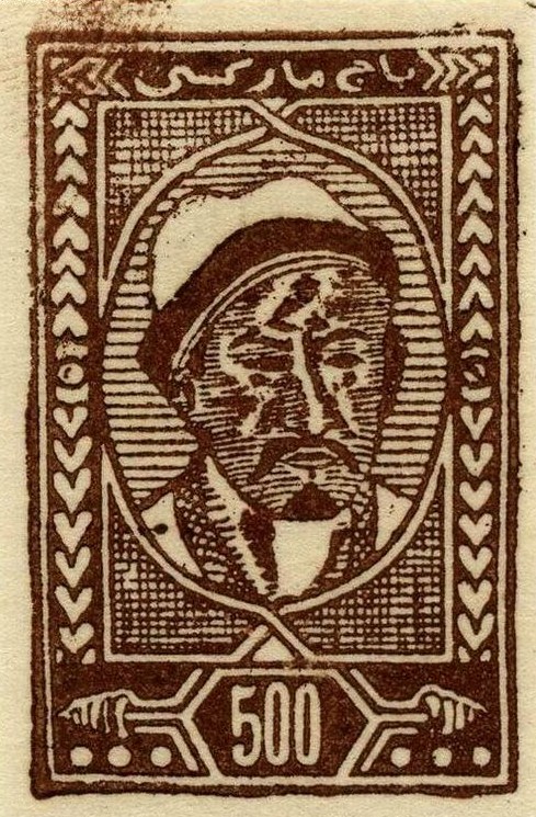 شەرقىي تۈركىستان جۇمھۇرىيىتى 1945-يىلى تارقاتقان، سادىر پالۋان سۈرىتى چۈشۈرۈلگەن 500 دوللارلىق باج ماركىسى