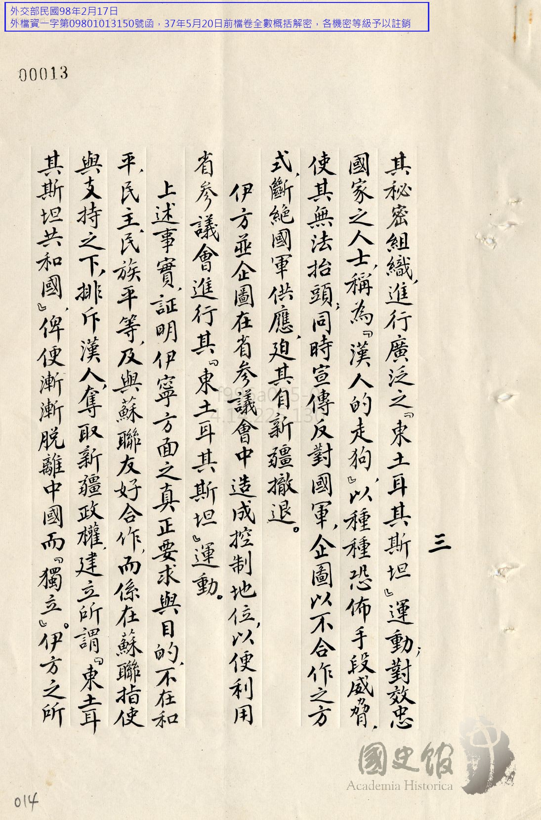 ئىلاۋە: ھۆرمەتلىك ئوقۇرمەن. مەزكۇر يازما تەيۋەن دۆلەتلىك تارىخى سارىيىدا ساقلىنىۋاتقان شەرقىي تۈركىستان جۇمھۇرىيىتىگە مۇناسىۋەتلىك ئارخىپ ھۈججەتلىرىدىكى 1947-يىلى ئىيۇلدا جياڭ جېشىغا يوللانغان بىر پارچە دوكلاتتىن تەرجىمە قىلىنىپ تەييارلاندى. بۇ دوكلات گېنىرال جاڭ جىجۇڭ خىتاي ھاكىمىيەتىدىكى جياڭ جېشىنى ئۆز ئىچىگە ئالغان مۇھىم ئەربابلارغا شەرقىي تۈركىستاننىڭ 11 ماددىلىق بىتىم تۈزۈلگەندىن تارتىپ 1947-يىلىنىڭ ئالدىنقى يېرىمىغىچە بولغان ۋەزىيىتى ھەققىدە يازغان دوكلاتىغا بېرىلگەن باھا ۋە تەكلىپتىن ئىبارەت. جاڭ جىجۇڭنىڭ دوكلاتى ئۇ 1946-يىلى ئاۋغۇستنىڭ ئاخىرى ئىلىنى ۋە 1947-يىلى ئاپرېلدا جەنۇبتىكى ۋىلايەتلەرنى زىيارەت قىلغاندىن كېيىن شەرقىي تۈركىستان ۋەزىيىتىگە بېرىلگەن ئومۇمي باھا ئىدى. جاڭ جىجۇڭنىڭ دوكلاتىغا قارىتا بۇ پىكىرلەرنى بەرگەن كىشىلەر خىتاي مەمۇرىي مەھكىمىسى (行政院) نىڭ باشلىقى جاڭ چۈن (張羣 ياكى جاڭ يۆجۈن 張岳軍)، دۆلەت مۇداپىئە مىنىستېرى بەي چۇڭشى (白崇禧)، خىتاي دۆلەت ئارمىيەسى باش شىتاب باشلىقى چىن چىڭ (陳誠 ياكى چىن تسىشيۇ 陳辭修) ۋە تاشقىي ئىشلار مىنىستېرى ۋاڭ شىجې (王世杰 ياكى ۋاڭ شۆتىيڭ 王雪艇) قاتارلىقلار بولۇپ، خىتاي ھاكىمىيەت قاتلىمىدا ئەڭ مۇھىم ئورۇندىكى ئەربابلار ھېسابلىناتتى. دوكلات شەرقىي تۈركىستان جۇمھۇرىيىتىنىڭ 11 ماددىلىق بىتىمدىن كېيىنمۇ مەۋجۇت بولغانلىقى، ئەمەلىي مۇستەقىللىقنى ساقلاش بىلەنلا قالماي تېخى ئازات بولىمغان يەتتە ۋىلايەتنى قولغا كەلتۈرۈپ، ۋەتەننىڭ تولۇق مۇستەقىللىقىنى ئىشقا ئاشۇرۇش ئۈچۈن ھەرىكەت قىلغانلىقى قاتارلىقلارنى دەلىللىسە، خىتاينىڭ 1947-يىلىنىڭ كېيىنكى يېرىمىدىن تارتىپ شەرقىي تۈركىستان جۇمھۇرىيىتىنى تەشۋىقات يولى ئارقىلىق تاشقىي ياردەمدىن ئايرىپ تاشلاش ۋە ئەڭ ئاخىرىدا ھەربىي ھەرىكەت ئارقىلىق يوق قىلىشتىن ئىبارەت تۈرلۈك ھىلە-مىكلىرلىرى ھەققىدە مۇھىم ئۇچۇر بېرىدۇ.
