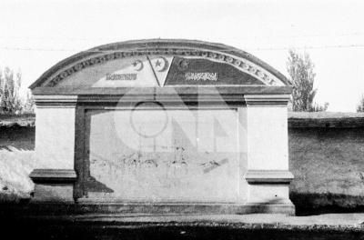 مىللىي ئارمىيە باش قوماندانلىق شىتابى ئالدىدىكى شەرقىي تۈركىستان جۇمھۇرىيىتى دۆلەت گىربى ۋە ھەربىي بايراقلىرى سىزىلغان تام. 1947-يىلى ئاۋغۇست