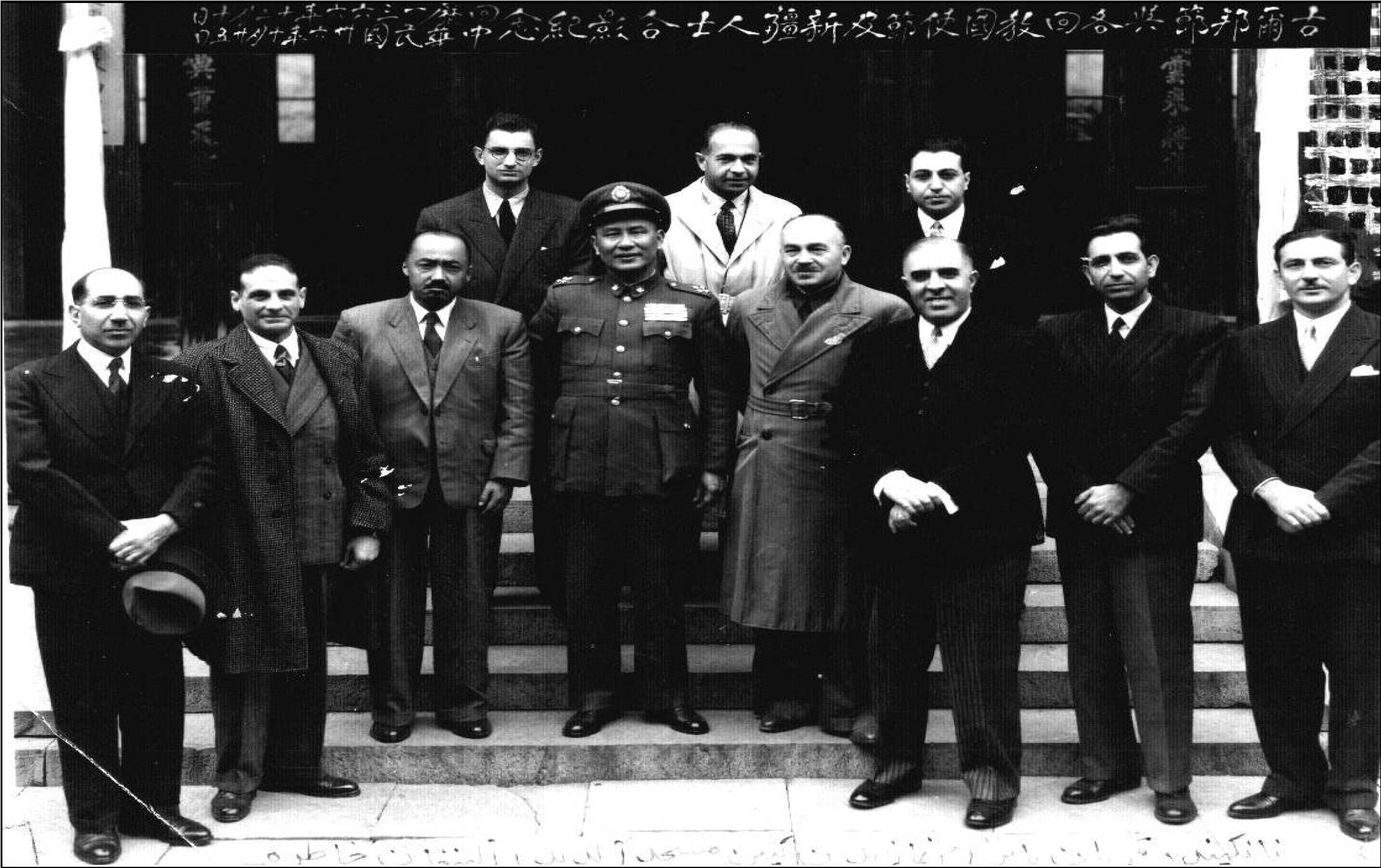 رەسىم: بەي چۇڭشى شەرقىي تۈركىستانلىقلاردىن مۇھەممەدئىمىن بۇغرا ۋە بۇرھان شەھىدى ۋە مۇسۇلمان ئەللەرنىڭ خىتايدا تۇرۇشلۇق باش ئەلچىلىرى بىلەن نەنجىڭدە، 1947-يىلى