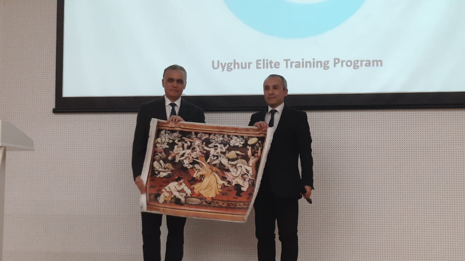 سەرخىللار مائارىپى يىتەكچىسى دوكتور مەخمۇتجان ئۆزئۇيغۇر ئەپەندى ئاكادېمىيە رەئىسى دوكتور رىشات ئابباس ئەپەندىگە سەرخىللار مائارىپىغا كۆڭۈل بۆلگەنلىكىگە رەھمەت ئېيتىپ ئۇيغۇر كېلاسسىك سەنئىتى تەسۋىرلەنگەن گېلەم تەقدىم قىلدى.