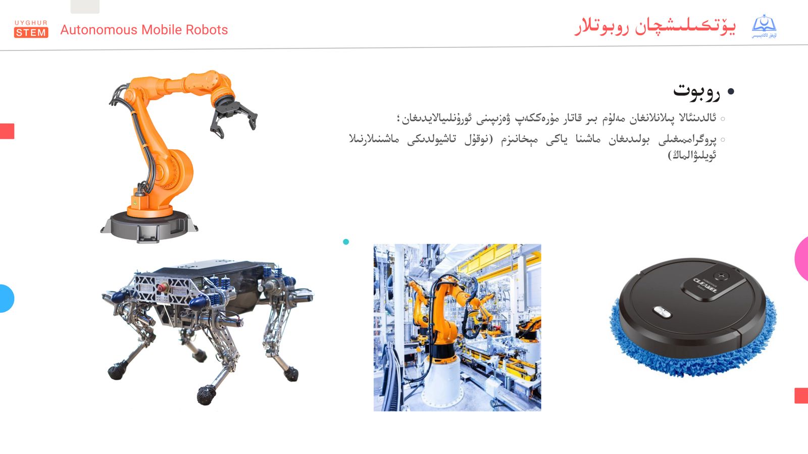 بۇ قارارلىق تەربىيەلەش، Uyghur STEM قۇرغۇچىسى مۇھەممەت ئىمىن بەكتۇر ئەپەندىنىڭ «يۆتكىلىشچان روبوتلار» تېمىسىدىكى لېكسىيەسى بىلەن باشلىدى. لېكىسىيەدە روبوتلار ھەققىدە ئەتراپلىق ۋە كەڭ دائىرىلىك چۈشەنچە بېرىلگەن بولۇپ، قاتناشقۇچىلارغا يۆتكىلىشچان روبوتلارنىڭ تۈرلىرى، روبوتلارنى تەشكىل قىلغۇچى قاتتىق ۋە يۇمشاق دېتاللارنىڭ تۈزۈلۈشى، ئىشلەش پرېنسىپلىرى، كېنىماتىكىلىق ھەرىكەت تەڭلىمىلىرى، ماتېماتىكىلىق ۋە فىزىكىلىق پرېنسىپلىرى، روبوتلارنىڭ سىرتقى دۇنيادىكى ئۇچۇرلارنى سېزىش، بىر تەرەپ قىلىش ۋە قارار چىقىرىش مېخانىزملىرىدىكى «سېزىش (بىلىش) – ئويلاش – ھەرىكەتكە ئۆتۈش» (see-think-act) ئايلانما ھالقىسىدا سۈنئىي ئەقىلنىڭ جۈملىدىن ماشىنا ئۆگىشىنىڭ قانداق رول ئوينايدىغانلىقى، يېقىنقى يىللاردا مودا بولۇۋاتقان يۆتكىلىشچان روبوتلار ۋە قوللىنىش ساھەلىرى، بۇ ساھەدىكى ئاساسلىق تەرەققىياتلار، يۈزلىنىۋاتقان خىيىم-خەتەر، تەھدىتلەر ۋە شۇنداقلا كەلگۈسى ئۈچۈن پايدىلىق پۇرسەتلەر جانلىق ئەمەلىي مىساللار بىلەن تونۇشتۇرۇلدى.