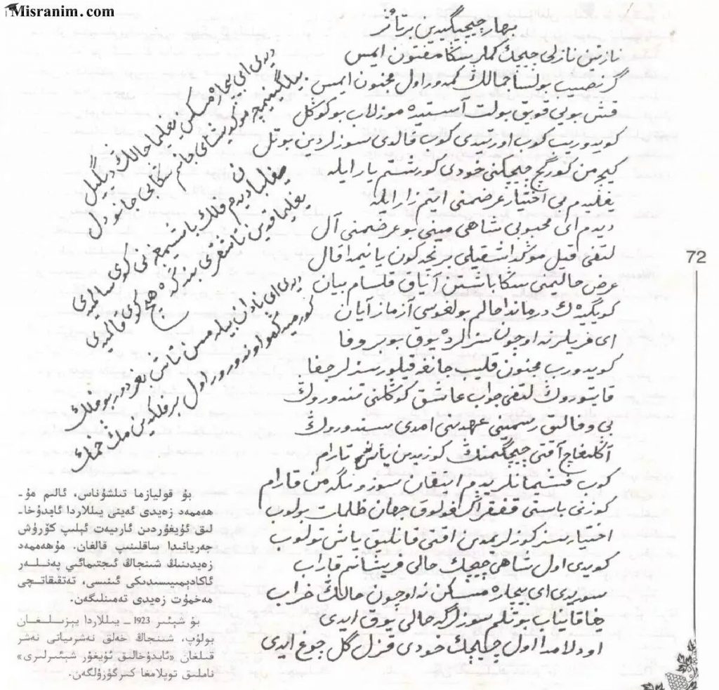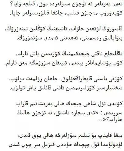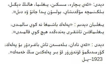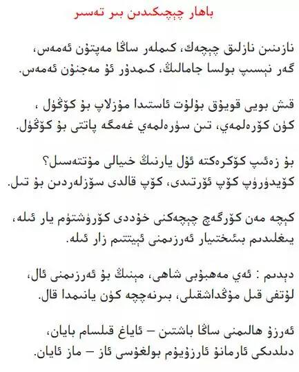 ئابدۇخالىق ئۇيغۇرنىڭ 1923-يىلدىكى قوليازمىسى يوللىغۇچى: ئاكادېمىيە ۋاقتى: ئاپرېل 13, 2017 ئورنى: ئەدەبىيات گۈلزارى ئۆت يۈرەك ئۇيغۇر شائىرى ئابدۇخالىق ئۇيغۇرنىڭ 1923 – يىلىدا ئۆز قولى بىلەن يازغان «باھار چېچىكىدىن بىر تەسىر» ناملىق شېئىرىنىڭ قوليازمىسى Tweet Share