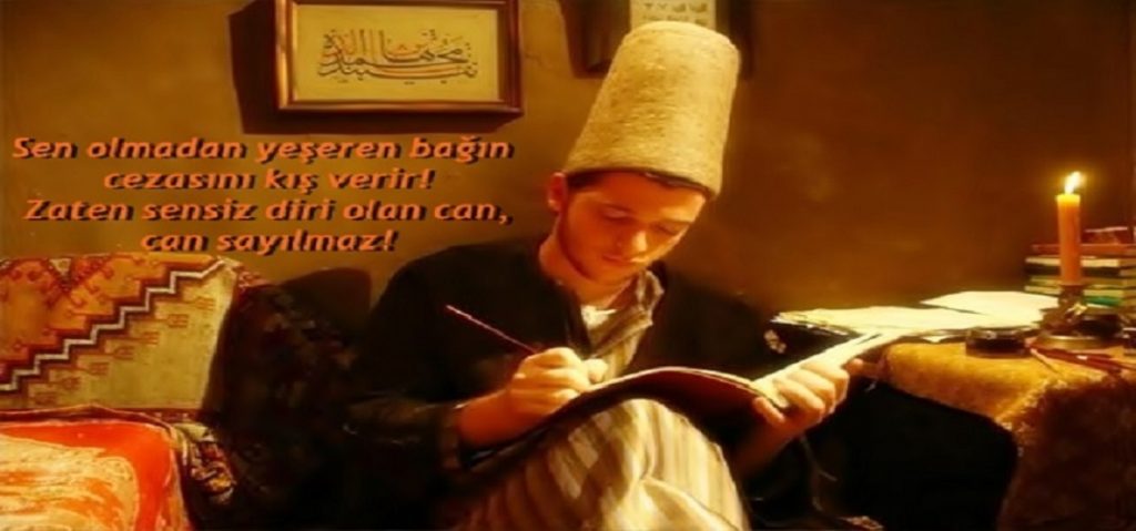 مېنىڭ جېنىم، ئىشىكنىڭ ئالدىدا ئىپار، ئەنبەر پۇراقلىرىنىڭ ئىچىدە بىھۇش بولغانتى. يۈز مىڭلىغان مېنىڭدەكلەر سېنىڭ گۈزەل يۈزۈڭگە دائىم ھەيراندۇر. بىز باشقىلار قىلغان ئىشلاردىن ۋاز كەچكەن ئېغىر بېسىق مەستلەردىن. پۈتۈن ئالەم ئوڭتەي-توڭتەي بولۇپ كەتسە، نېمە بولاتتى؟ ئاشىقىڭ باقى بولسۇن… ئاشىقىڭ قولىنى بىر شىلتىسا بۇ كۆكلەرنىڭ تىشىغا كۆكلەردىن كۆكلەرنى يارىتىدۇ ۋە ئاللاھ يۇزلەرچە يېڭى يېڭى زامان يارىتىدۇ.