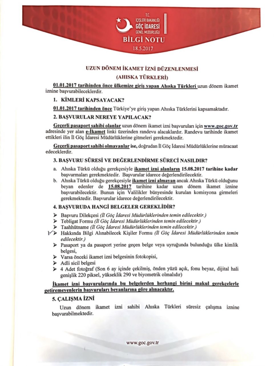 2017 – يىلى 5 – ئاينىڭ 18 – كۈنى تۈركىيە كۆچمەنلەر ئىدارىسىنىڭ ئاھىسكا تۈركلىرى ئۈچۈن مەخسۇس تەييارلىغان ئۇزۇن مەزگىللىك ئىقامەت ھەققىدىكى مەلۇماتى [3]